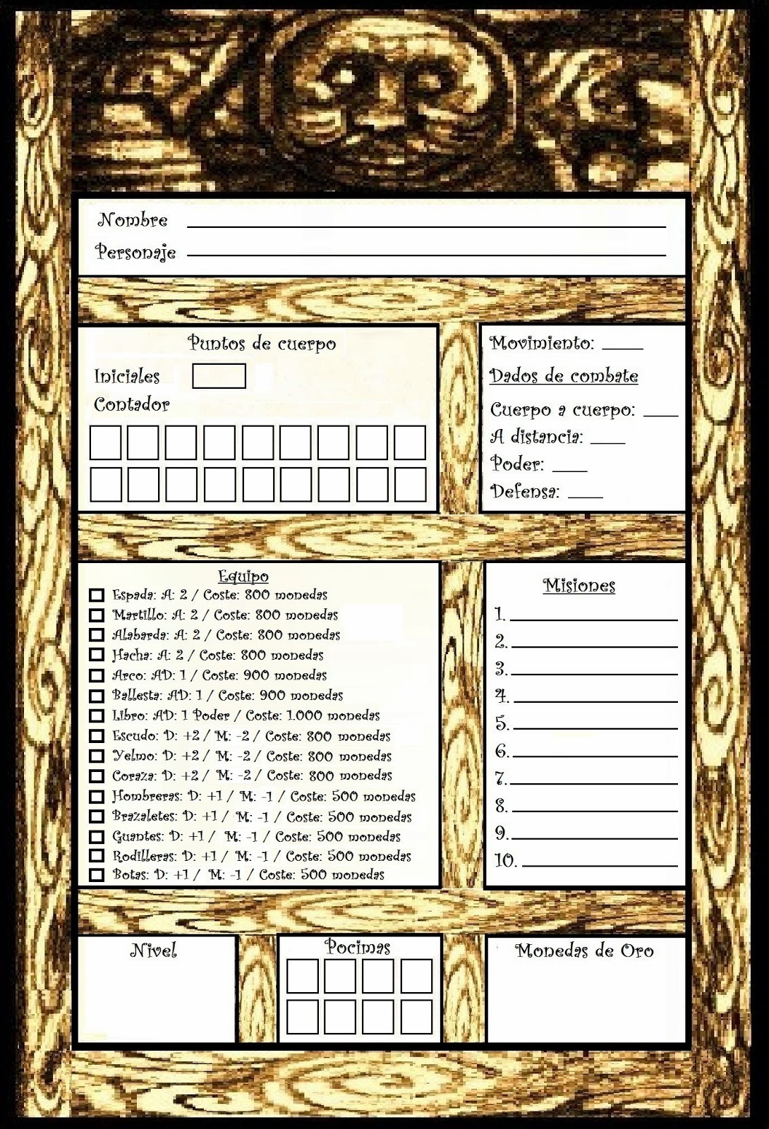 Equipo: En este apartado se marcaran las armas y las armaduras que lleves equipadas, esto hará que los modificadores de cada arma o armadura te sumen o resten dados de combate o movimiento.