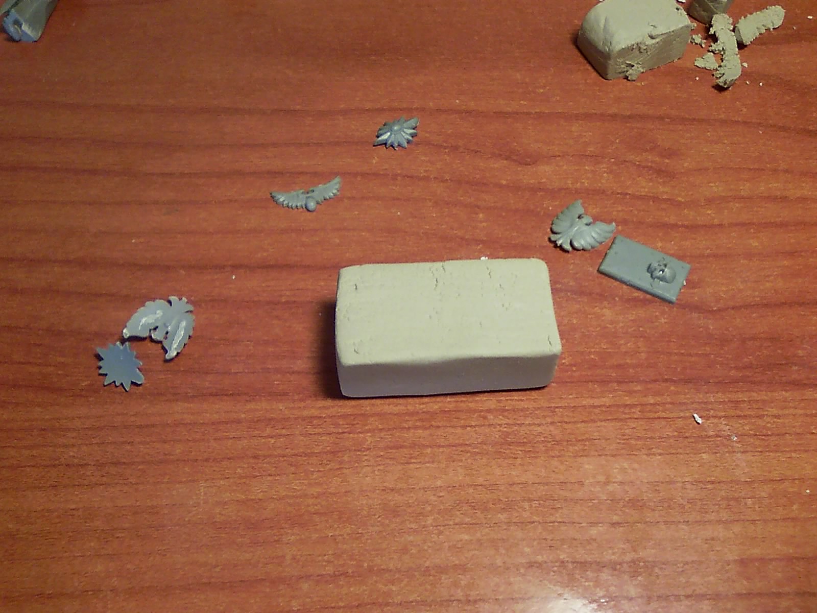 Colocamos unas piezas de decoración. En mi caso utilicé unas piezas que tenía por casa, sobrantes de blisters sueltos. Rascamos un poco la masilla para hacerle un hueco a los objetos de decoración.